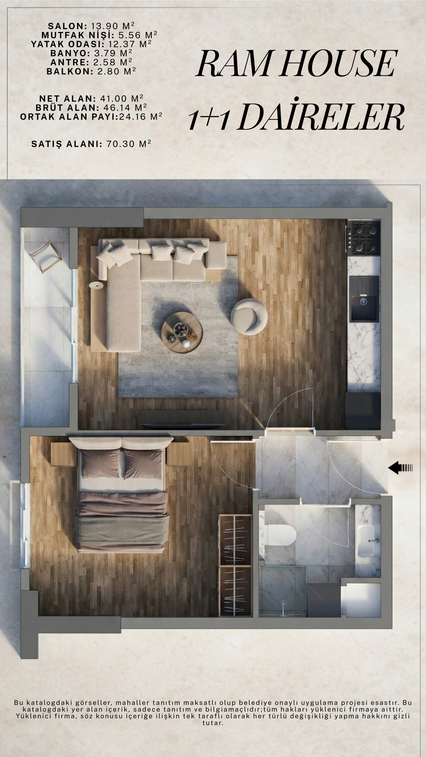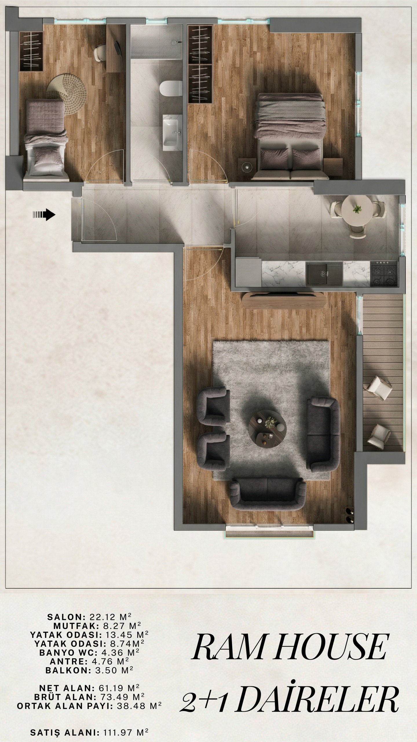 10 katlı yapılaşması ve 96 bağımsız bölüm planlamasıyla tasarlanan Ram House’ta 1+1 ve 2+1 daire seçenekleri bulunuyor. Kullanıcı konforunu tamamlamak için projede açık ve kapalı otopark alanları planlandı.
